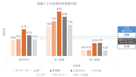 「管理職・マネージャー」は日本全体の平均である6.06を大きく超えているものの、「オペレーター」「SV・リーダー」国内コンタクトセンター平均を下回り、役割間での幸福度格差が浮き彫りとなりました。