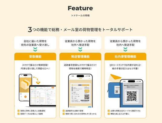 郵便物・配達物管理クラウドアプリケーション「トドケール」「トドケール」はスマートな総務・メール室のための郵便物・配達物管理クラウドアプリケーションです。大きな設備投資なく、スマートフォンとPCで手軽に郵便物や配達物のデジタル管理及び処理の自動化を始めることができます。障がい者雇用で運用するメール室のハイブリッドワーク適応化や受け取る社員のリモートワーク効率化とそれに伴うオフィス面積の最適化など、多くの効果が期待できます。