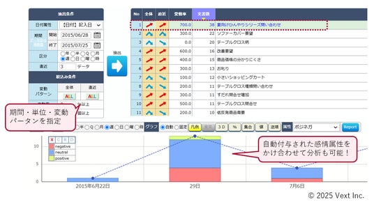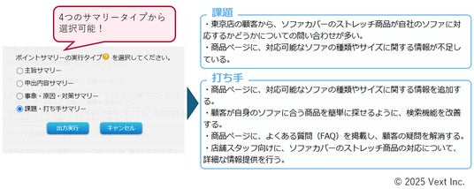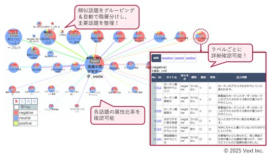 ベクスト株式会社(代表取締役社長:小橋寿彦、本社:東京都目黒区、以下 ベクスト)は、テキストマイニングツール「VextMiner」の新機能として、簡易VOC分析機能「VoC Lens」およびグラフ解釈・サマリー機能「VextInsight powered by Local SLM」を2025年1月30日(木)にリリースいたしました。両機能とも、ベクスト独自のテキストマイニング技術と生成AIを組み合わせることにより、「高度な分析」と「手軽さ」の両立を実現しています。分析担当者の分析スキルや業務知識に関わらず、誰もが・かんたんに・すばやくデータを分析・理解して業務活用のための気づきを得ることを強力にサポートします。これまで分析の課題となりやすかった、分析にかかる工数や分析技術の属人化を改善します。