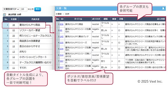ベクスト独自のテキストマイニング技術によって類似話題をグルーピングし、データ中の話題を多い順に並べたランキング結果を確認できます。ワンクリックで各グループの原文を参照し、LLMによって生成された各話題のタイトルや感情属性を確認することもできます。