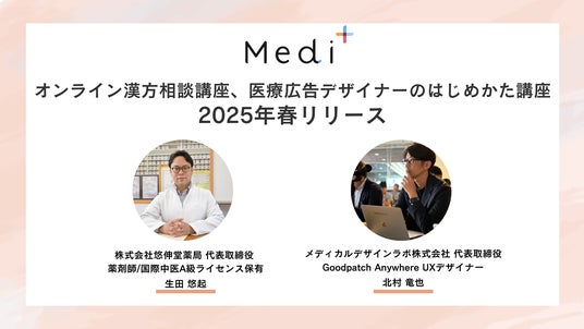 株式会社Medited(本社:東京都新宿区、代表取締役/薬剤師:松岡磨衣子)は、医療資格保有者が医療資格と経験という強みを活かした新しい働き方に挑戦するための講座「第1回 Medi+オンライン漢方相談講座」「第2回 Medi+医療広告デザイナーのはじめかた講座」を、2025年2月、4月に各講座をリリースいたします。