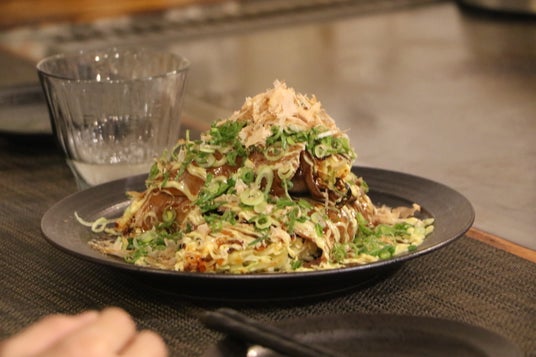 最後はやっぱり大阪!お店の看板メニュー『お好み焼き 牛玉』もいただくことに。斬新な仕上がりに2人ともびっくり!