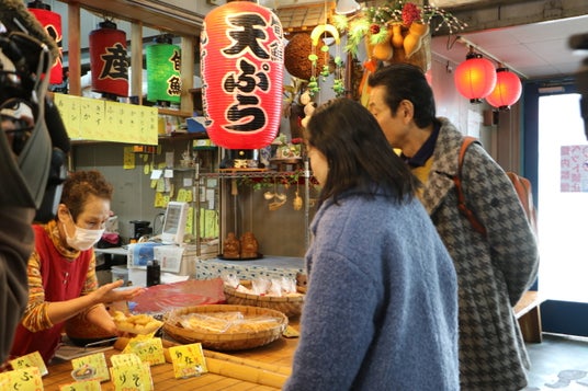 市場内を散策していると、注文するとその場で揚げてもらえる天ぷら屋さんが。2人は早速、地物の『ふぐ』を揚げてもらうことに。