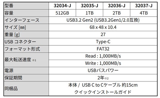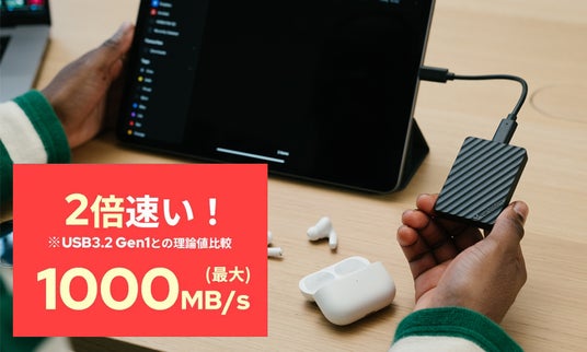 USB 3.2 Gen2インターフェースを搭載し、データ転送速度は読み出し最大1,000 MB/秒、書き込み最大1,000 MB/秒※と、大容量データの転送やビデオ編集、ゲームパフォーマンスの最大化にも最適です。 WindowsとMacの両方に対応しており、付属品としてUSB Type-C to Cケーブル(20cm) を同梱しております。