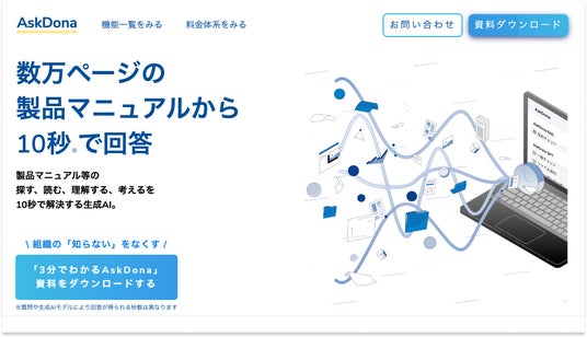 AskDonaは、理化学研究所、R-CCSのスーパーコンピュータ「富岳」サポートサイトへの導入実績を持ち、1万6000ページを超える手順書やマニュアルから適切な情報を迅速に探し出し、ユーザーが理解できない内容を分かりやすく伝えることを可能としています。この実証実験を通じて、人が情報探索時に無意識に行っている「探す・読む・理解する・考える」という一連のプロセスを、AskDonaが瞬時に実行しユーザーをサポートできることが証明されました。この知見に基づき、商品・製品に関するマニュアル、手順書、調査レポートなど、高度な情報探索が求められる領域にAskDonaを特化し、企業が抱える「情報過多」という課題をAskDonaがどう解決できるのかわかりやすく伝えるために今回リニューアルをいたしました。