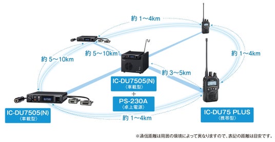 本製品は、65ch→75ch+10ch<ペア/中継用>の増波に対応したデジタル簡易無線機(免許局)です。IC-DU7505・IC-DU7505N同士なら約10km、携帯型のトランシーバー(5W)となら約4kmの範囲で通信ができます。さらに、中継装置を使用して、簡単に通話距離を約2倍に拡張することが可能です。加えて、IC-DU7505NはIP接続にも対応。IC-DU7505N 同士をLAN接続することで、電波が届きにくい地上や多層階ビルでの通信を実現します。また、卓上電源PS-230A(オプション)を活用することで、基地局のように使用することもできます。これにより、車両間だけでなく、物流センター(基地局)と配送車、ビル管理事務室(基地局)と作業員など、様々なシーンでの使用が可能です。