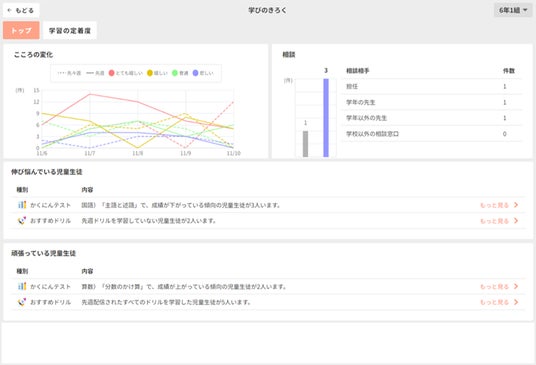 子どもたちの教育データを元に一人ひとりの学力定着度合いをAIが分析し、先生の指導のサポートや、それぞれの児童生徒に合った学びの学習方法を提案する、AIドリル機能とダッシュボード機能を中心としたサービスです。