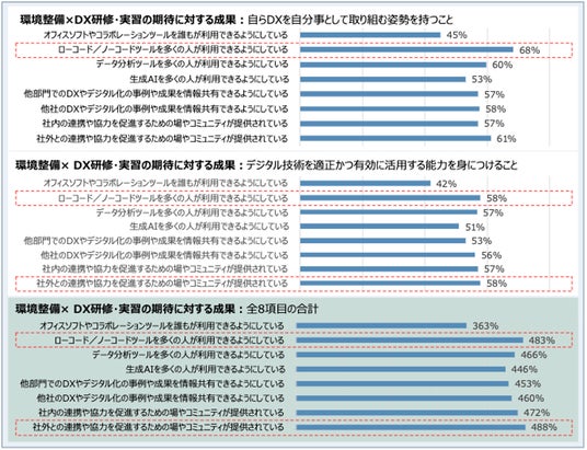 DXの成否を分ける従業員の行動変容を促すために必要な環境整備を探る調査では、「ローコード/ノーコードを多くの人が利用できるようにする」ことが、最も効果的であることが明らかになりました。これにより、「自らDXを自分事として取り組む姿勢を持つこと」や「デジタル技術を適正かつ有効に活用する能力を身につけること」が大幅に向上しています。また、社外との連携を促進する場やコミュニティの提供も、DX研修の成果を高める重要な要素として挙げられました。