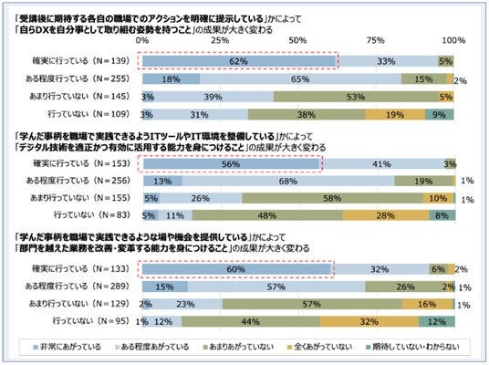 DX研修・実習の成果を高める方策を探るため、研修後の取り組みと成果の度合いの関係を見ると、研修実施後の取り組みとして、「受講後に期待する各自の職場でのアクションの明確な提示」や、「学んだ事柄を実践できるIT環境の整備」、「学びの実践機会の提供」などが、成果に大きな影響を与えることが明らかになりました。