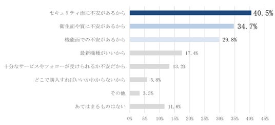 理由は、「セキュリティー面に不安があるから(40.5%)」が最も多く、次いで「衛生面や質に不安があるから(34.7%)」となっています。古い機種への機能的な不満よりも、子どもに使用させる上でセキュリティー面・衛生面に不安が大きいことが読み取れます。