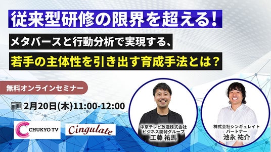 データサイエンスと学術的知見をもって組織開発を支援する株式会社シンギュレイト(本社:東京都渋谷区、代表取締役:鹿内 学、以下シンギュレイト)は、「従来型研修の限界を超える!メタバースと行動分析で実現する、若手の主体性を引き出す育成手法とは?」を、中京テレビ放送株式会社(本社:名古屋市中村区、代表取締役社長:伊豫田 祐司、以下中京テレビ放送)との共催により、2025年2月20日(木)に開催いたします。