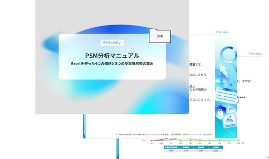 全国1,300万人の調査モニターへ、500円からネットリサーチが実施できる、セルフ型アンケートツール“Freeasy(フリージー)”を展開するアイブリッジ株式会社(本社:大阪市福島区、代表取締役社長:荒川和也)は、リサーチやマーケティングに役立つ資料『PSM分析マニュアル-Excelを使った4つの価格と5つの受容価格帯の算出-』を無料公開いたしました。