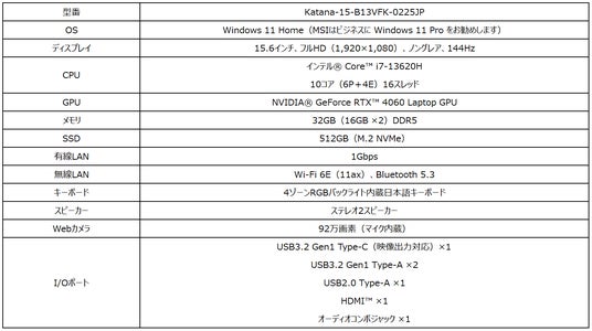 「Katana-15-B13VFK-0225JP」は、2025年の最新ハンティングアクションゲームをプレイするために必要な機能・性能を備えたハイスペックゲーミングノートPCです。