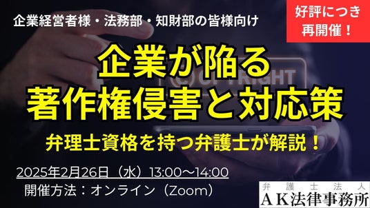 知的財産分野に精通した弁護士法人AK法律事務所(所在地:千代田区神田)は、「企業が陥る著作権侵害違反と対応策」セミナーを無料・オンラインで2025年2月26日(水)に開催いたします。