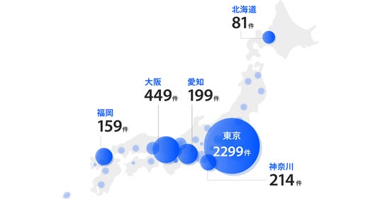 都道府県別に利用者の傾向を見ると、東京都(2299件)、大阪府(449件)、神奈川県(214件)、愛知県(199件)、福岡県(159件)が上位となりました。東京の利用者が最も多いものの、地方都市にも利用が広がっています。