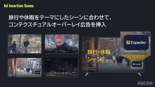 昨年11月に「ABEMA」が実証実験を実施した「コンテクスチュアルオーバーレイ広告」は、その技術や広告手法を番組などの映像を対象に応用するもので、番組内の特定のシーンや場所に関連する広告を該当映像の枠内に表示する新しい広告手法として、近年注目を集めています。この手法により、広告主は訴求したい商品やメッセージと関連性の高い場面内でブランドストーリーを伝えることができ、視聴者は視聴を中断されることなく、番組の文脈と共に自然にブランドメッセージを受け取る事ができるため、「良質な広告体験」として広告効果も期待されます。