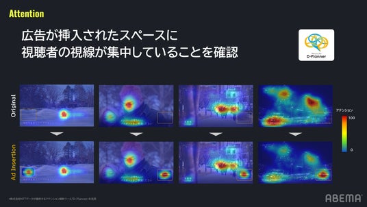 株式会社NTTデータが提供するクリエイティブ評価ソリューション「D-Planner(R)」のアテンション解析を活用した結果、広告が挿入されたエリアにおいて視聴者の視線が集中していることが明らかになりました。広告エリアの平均アテンション度合いは非広告エリアと比較して約4.8倍と大きな差が確認されています。