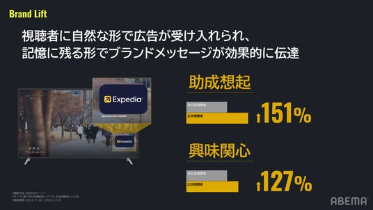 「ABEMA」が実施したブランド調査では、「コンテクスチュアルオーバーレイ広告」が視聴者の「エクスペディア」に対するブランド認知が広告非表示の時と比較して151%に、興味関心が127%へとそれぞれ大幅に向上したことが確認されました。これらの成果は、広告が視聴者に自然な形で受け入れられ、「エクスペディア」のブランドメッセージが記憶に残る形で効果的に伝達されたことを示しています。