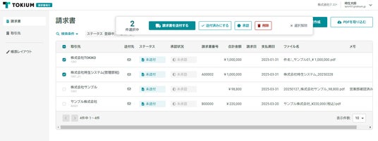 請求データのCSVファイルやPDFの請求書を一括で取り込み、オンライン上で複数の請求書を効率的に作成できます。さらに、作成した請求書に記載された取引先情報に基づき送付先の情報を自動的に紐づけられるため、手間なく送信可能です。
