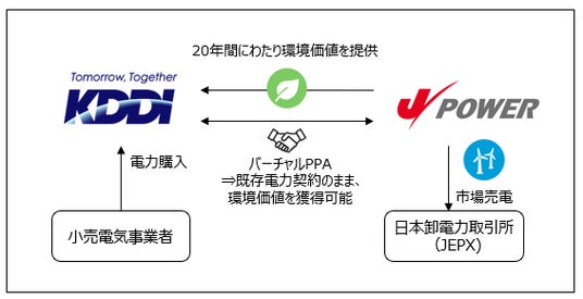 KDDI株式会社(本社:東京都千代田区、代表取締役社長 CEO:高橋 誠、以下 KDDI)と、電源開発株式会社(本社:東京都中央区、代表取締役社長 社長執行役員:菅野 等、以下 Jパワー)のグループ会社で風力発電事業を担う株式会社ジェイウインド(本社:東京都中央区、代表取締役:戸田 勝也、以下 ジェイウインド)は、2024年12月27日付で陸上風力発電に係るバーチャルPPA(再生可能エネルギーに係る非化石証書譲渡契約、以下 本PPA)を締結したことをお知らせします。