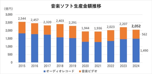 2024年年間の音楽ソフト(オーディオレコード・音楽ビデオの合計)生産実績は、数量で前年比89%の1億4,137万枚・巻、金額で同93%の2,052億円と前年減となりましたが、3年連続で2,000億円台を維持しています。