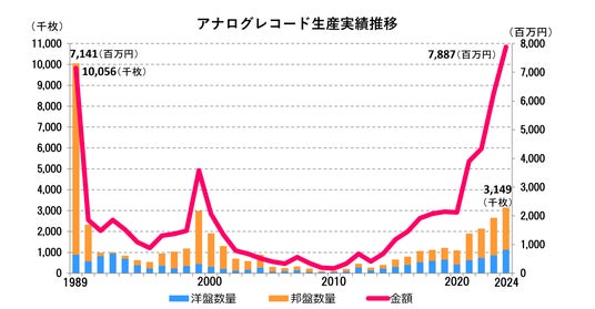 オーディオレコードは前年比102%と増加し、好調が続くアナログディスク(アナログレコード)は、数量が前年比117%の314万9,000枚、金額が同126%の78億8,700万円と、1989年以来の70億円超えとなりました。