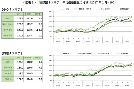 首都圏全体の平均価格は前月比+0.7%と5カ月連続で上昇した。また、前年同月比は+1.6%と4カ月連続で前年同月を上回った。