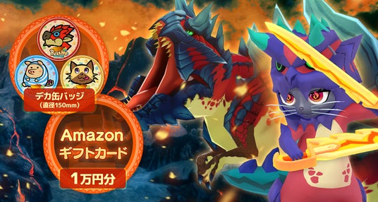 「モンスターハンターパズル アイルーアイランド」公式X (@MHPuzzles)をフォローし、 キャンペーン期間中に指定されたポストをリポストした方から抽選で10名様に1万円分のAmazonギフトカード(デジタルギフト)、抽選で30名様にスタンド・壁掛けタイプデカ缶バッジをプレゼントいたします。
