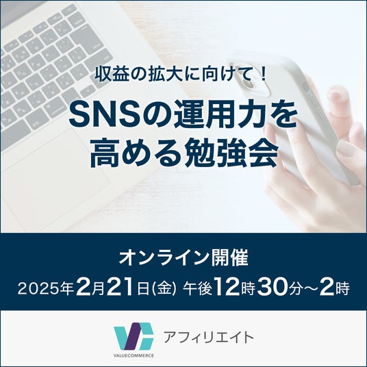 2024年12月に開催した勉強会( https://www.valuecommerce.co.jp/news/c_press/c_safety/6032/ )に引き続き、SNSマーケティングの豊富なノウハウを持っている株式会社コムニコより講師をお招きします。今回は主に通信カテゴリを事例にご説明しますが、プログラム内容は幅広いアカウントにも活用できる内容です。この勉強会でSNSの運営力を高めて、アフィリエイトの収益拡大を目指しましょう。