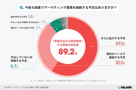 副業でマーケティング業務を行う人の多くは、現在の活動を拡大または継続する意向を持っています。約9割近く(89.2%)が「拡大する」または「現状維持」と回答しており、副業としてのマーケティング業務が収入ややりがいを感じられる活動として受け入れられていることが示唆されます。一方で、副業を減らしたり停止したいと考える人はほとんどおらず、再開を希望する人も一定数いることから、マーケティング業務の副業市場が活発であることがうかがえます。
