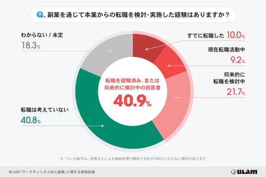 マーケター人材登録者数国内最大級のマーケティング領域の副業(複業)マッチングサービス「カイコク」を運営する株式会社BLAM(本社:東京都品川区、代表取締役:杉生遊)は、「マーケティング人材の副業と転職」に関して調査を行いましたので、結果を報告させていただきます。