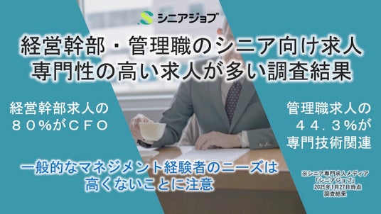 シニア転職支援の(株)シニアジョブ(本社:東京都新宿区/代表取締役 中島康恵/以下、シニアジョブ)は、サービス提供するシニア専門求人メディア「シニアジョブ」に掲載された管理職のシニア向け求人では専門技術に関連する管理の仕事が多く、同じく経営幹部のシニア向け求人ではCFO(最高財務責任者)の求人が多いなど、マネジメントスキルよりも専門的な知識とスキルを求められる求人が多かった調査結果を公表しました。