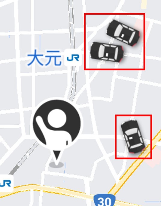 アプリ地図上に表示されるタクシーアイコンの色がタクシー会社に関わらずすべて黒色になります(アプリバージョン1.1.14以降対応)。