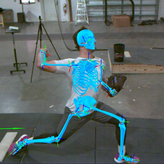 プロと同レベルのマウンド設備を完備した室内練習場にて、ネット越しに配置されたMiqus Videoカメラを用いてピッチングフォームの動作解析を行っています。完全同期したカラー映像がPCに直接取り込まれるため、即時のフィードバックも可能です。撮影後のワンクリックで、外部ソフトウェア「THEIA3D」(マーカーレスモーションキャプチャーエンジン)と「Visual3D」(骨格モデル解析ソフトウェア)が連動・自動演算/解析処理して、バイオメカニクスに基づいた詳細な解析結果を提供します。