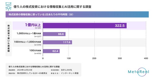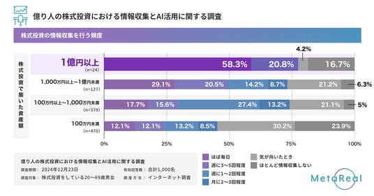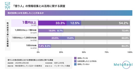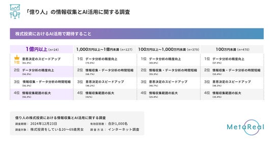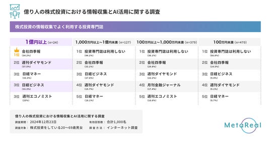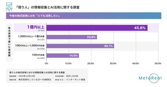 株式会社メタリアル(本社:東京都千代田区、代表取締役:五石順一)は、2024年12月、株式投資をしている20代~60代の男女1,000名を対象に、株式投資における情報収集とAI活用に関するアンケートを行いました。その結果、株式投資で1億円以上の資産を築いた「億り人」のうち、4割以上が情報収集を目的にAIを活用した経験があり、今後の株式投資にAIを活用したいと考えている「億り人」も4割以上いることが判明しました。さらに株式投資の情報収集に『会社四季報』を利用している「億り人」の割合は、5割以上にのぼりました。