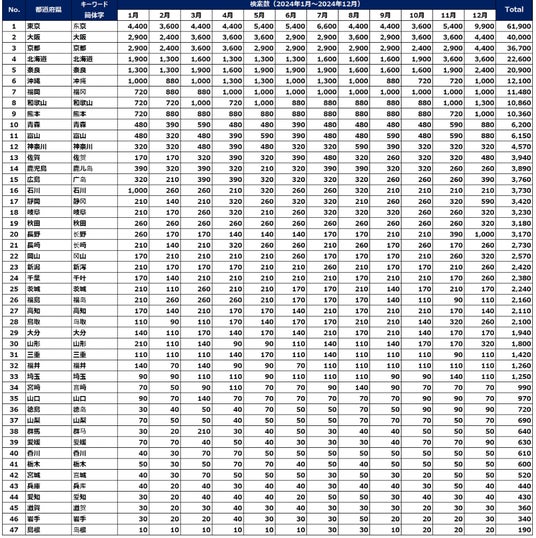 以下の表は、2024年1月~2024年12月の中国における「日本の都道府県」の検索数をまとめたものです。検索数の上位を占めた1位東京、2位大阪、3位京都の大都市圏及び、4位北海道、5位奈良、6位沖縄、7位福岡については、これまでアウンコンサルティングが発表した米国編、香港編及び、オーストラリア編の調査と同様の傾向であると考えられます。