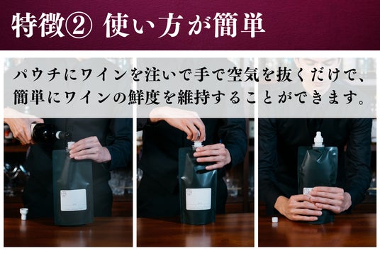 使い方は至ってシンプル。パウチから逆止弁キャップを外し、抜栓したワインを移し入れます。逆止弁キャップをしっかりと装着し、上部の小キャップは外しておきます。