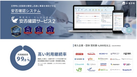 トヨクモの「安否確認サービス2」は、4,000社以上(2024年10月時点)が利用する法人向けの安否確認システムです。企業の存続および従業員の生活基盤となる災害後の早期事業復旧に重きを置き、安否の確認機能のみならず、その後の対策指示や情報共有を意識した、掲示板やメッセージ機能などを備えています。