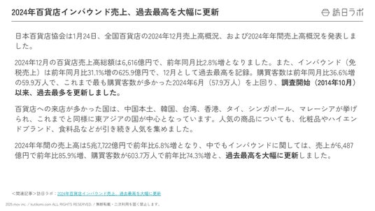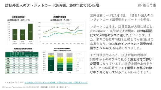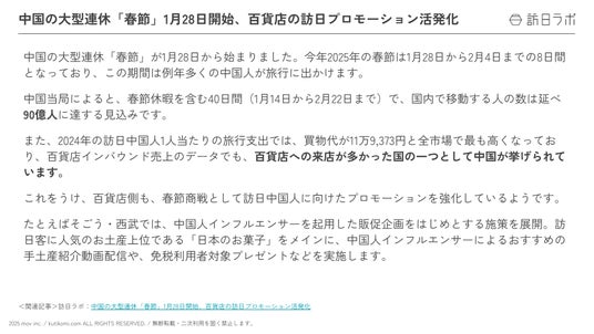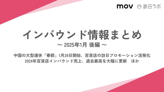 業界最大級のインバウンドビジネスメディア「訪日ラボ」及び 店舗向け集客一元化プラットフォーム「口コミコム」を運営する株式会社mov(代表取締役:渡邊 誠、本社:東京都渋谷区、以下mov)は、「インバウンドに関する最新トレンド・データ」「政府・自治体・企業などのインバウンド関連の取り組み」をはじめ、インバウンド対策に役立つニュースをまとめた「インバウンド情報まとめ【2025年1月後編】」を公開しました。