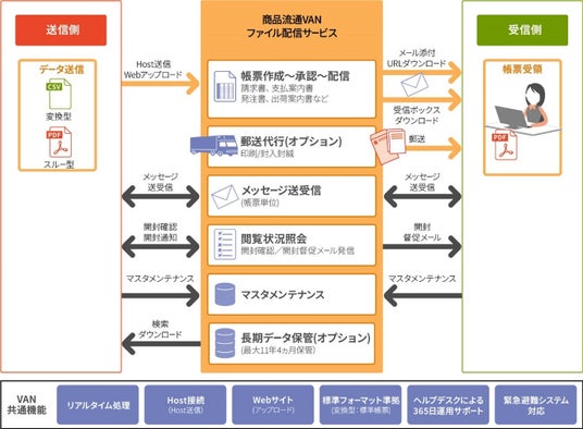 「ファイル配信サービス」は企業間でやりとりされる帳票を電子化し、Webやメールでの授受を実現するサービスです。送信側は従来のEDIサービスと同様、ファイネットにまとめてデータを送るだけでご利用可能です。帳票イメージ(PDFファイル)は、メールやWebで受信側へ配信されます。郵送にも対応しているため、受信側の意向にあわせた配信方法を選択でき、送信側の完全電子化を実現できます。ご利用いただける帳票は、酒類・加工食品業界の商慣習にそった標準書式(商品代金請求書、出荷案内書、販売促進金請求書、販売促進金支払案内書)に加えて各社の個別帳票に対応することも可能です。