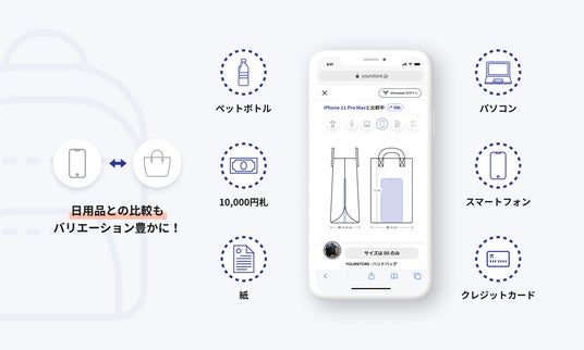 バリエーション豊かな日用品との比較で実用性を確認バッグやお財布などのファッションアイテム選びも、バーチャサイズでは豊富なアイテムのシルエットをご用意、一人ひとりで違う実用性を確認できます。