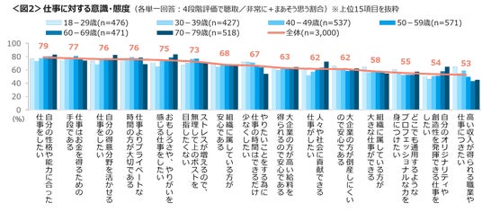 仕事に対する意識・態度は、「自分の性格や能力に合った仕事をしたい」「仕事はお金を得るための手段」「自分の得意分野を活かせる仕事をしたい」「仕事よりプライベートな時間の方が大切」「おもしろさや、やりがいを感じる仕事がしたい」「ストレスが増えるので、無理して上のポストを目指したくない」が7割台。<図2>
