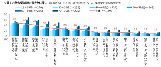年金受給後も働きたい人の理由は、「貯蓄や年金だけでは経済的に不安」「健康や体力を維持するため」「脳の老化を防止するため」が4割台。「社会とつながっていたい」「生きがいを感じたい」「いつまでも若々しくありたい」「人と接していたい」など精神的な理由は60~70代で高い。<図3>