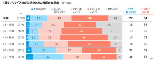 リタイア後の生活の資産は、かなり+やや不足していると思う人が64%、特に40代は72%と高い。<図5>