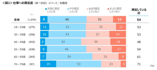 有職者の仕事に対する満足度は、非常に+やや満足しているが54%、40代の満足度は48%と半数に満たない。「まったく満足していない」割合は30~50代で高い。<図1>