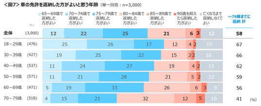 高齢者ドライバー(65歳以上)の車の免許返納をした方がよいと思う年齢を聴取したところ、「79歳までに返納した方がよい」は58%。実年齢で70代は、41%と最も低い。実年齢が低くなるほど、79歳までに免許を返納した方がよいと思う割合は、高まる傾向が顕著であった。<図7>