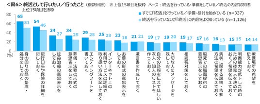 自分自身の「終活(人生の終わりを意識した事前準備)」として行いたい/行ったことは、「身の回りの品の整理・処分をしておく」「銀行口座や保険の詳細を記しておく」「延命治療の意思表示をしておく」「葬儀・法要の形式の意思表示をしておく」「エンディングノートを書いておく」が上位。<図6>