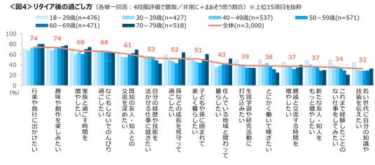 リタイア後の過ごし方は、「行楽や旅行に出かけたい」「趣味や創作を楽しみたい」が7割台。「家族と過ごす時間を増やしたい」「なにもしないでのんびり過ごしたい」「既知の友人・知人との交流を深めたい」は6割台。<図4>