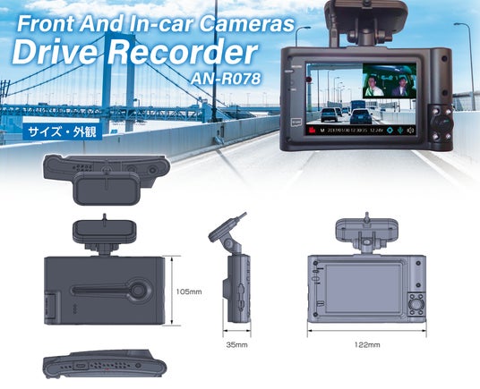 前方約200万画素の高画質で信号機やナンバープレートを記録しながら、約100万画素の車内用カメラで室内の記録も同時に行います。