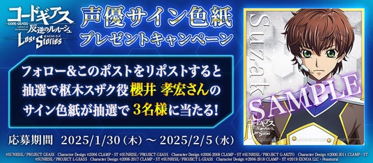 ★4スザク[罪とともに]、★4シャリオ[最強を超えて]の登場を記念し、スザク役 櫻井孝宏さん、シャリオ役 村瀬歩さんのサイン色紙キャンペーンを開催!